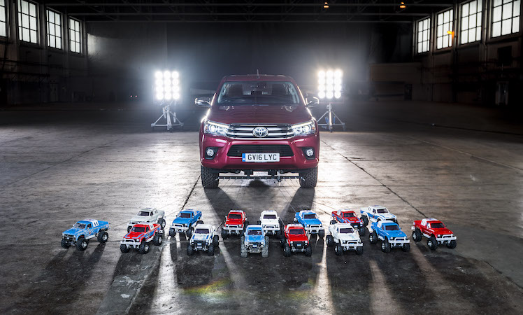 Pomysł na ciągnięcie Hiluxa przez zabawkowe modele pochodzi z kilkuminutowego filmu z lat 80., na którym 15 zdalnie sterowanych Hiluxów ciągnie swój pierwowzór. W ten sposób firma Tamiya udowodniła, że jej produkty to więcej niż zabawki dla dzieci. Po 30 latach Hilux stał się większy i cięższy, ale jak widać dzielne miniaturki poradziły sobie i tym razem.