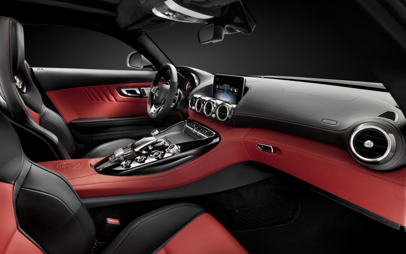 Na razie firma opublikowała dwa zdjęcia wnętrza nowego Mercedesa-AMG GT. Wizytówką kokpitu jest tzw. „stylizacja lotnicza”, której przykładem jest szeroka deska rozdzielcza wyglądająca, jak masywne skrzydło samolotu. Efekt ten jest potęgowany przez cztery centralne i dwa boczne otwory wentylacyjne. Dominująca konsola środkowa reprezentuje równie dynamiczny charakter. Jej kształt przywodzi na myśl wlot powietrza typu NACA, materiały wykończeniowe nawiązują do tych stosowanych w świecie motorsportu, a układ instrumentów na konsoli AMG DRIVE UNIT przypomina układ cylindrów w jednostce V8.